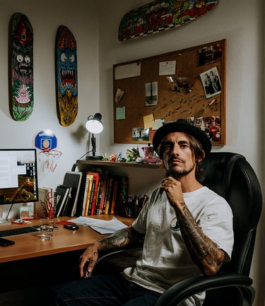 He grew up skateboarding and surfing, drawing early influence from the graphics of Zero Skateboards, Fallen Footwear, Mystery Skateboards—essentially the Jamie Thomas universe—as well as the iconic visuals of Santa Cruz Skateboards and many NHS brands.